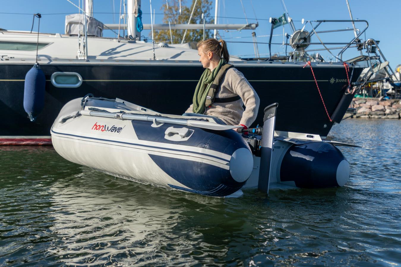 eLite liikuttaa hyvin myös apujollaa tai kumivenettä siirryttäessä isommalle veneelle.